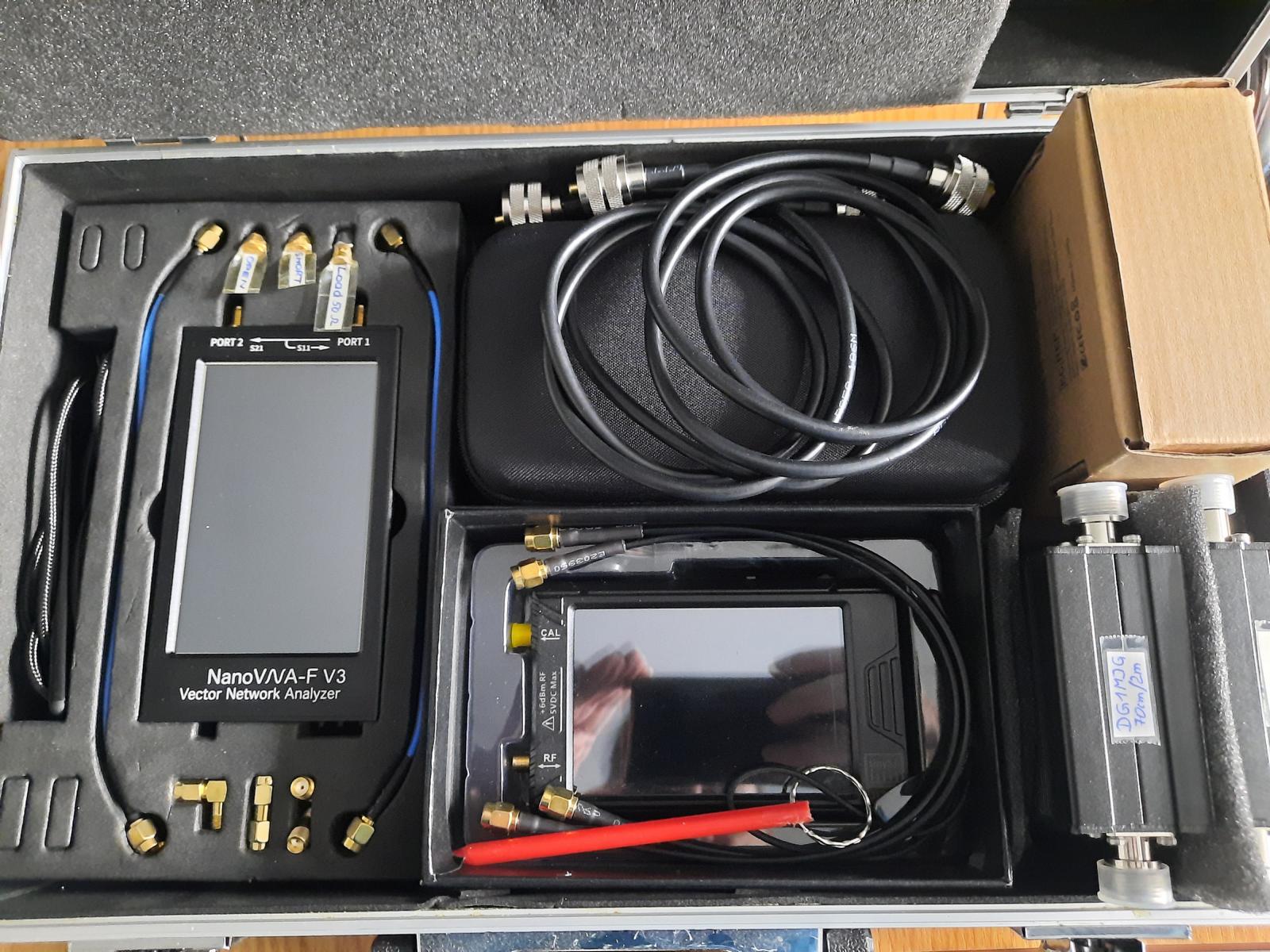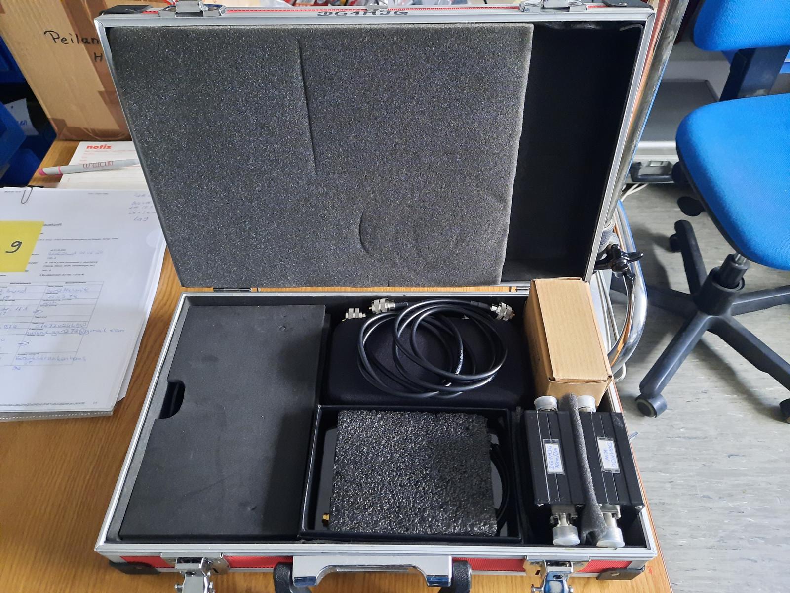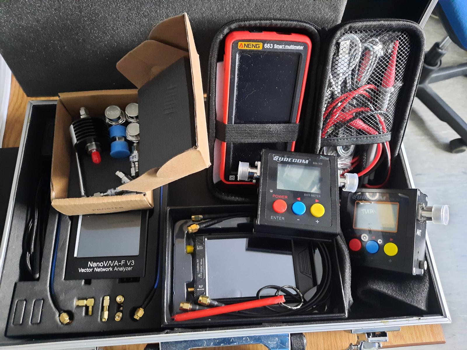 Damit man unterwegs auch all seine Messgeräte dabei hat und diese sauber aufgeräumt sind, habe ich mir in einen übrigen Koffer (Pollin 3er Set) die wichtigsten Messgeräte wie NanoVNA, TinySA Ultra und Multimeter sowie SWR/Power-Meter für Kurzwelle und VHF/UHF reingepackt. Schaumstoff im Deckel drückt leicht auf alles damit nichts wackelt.