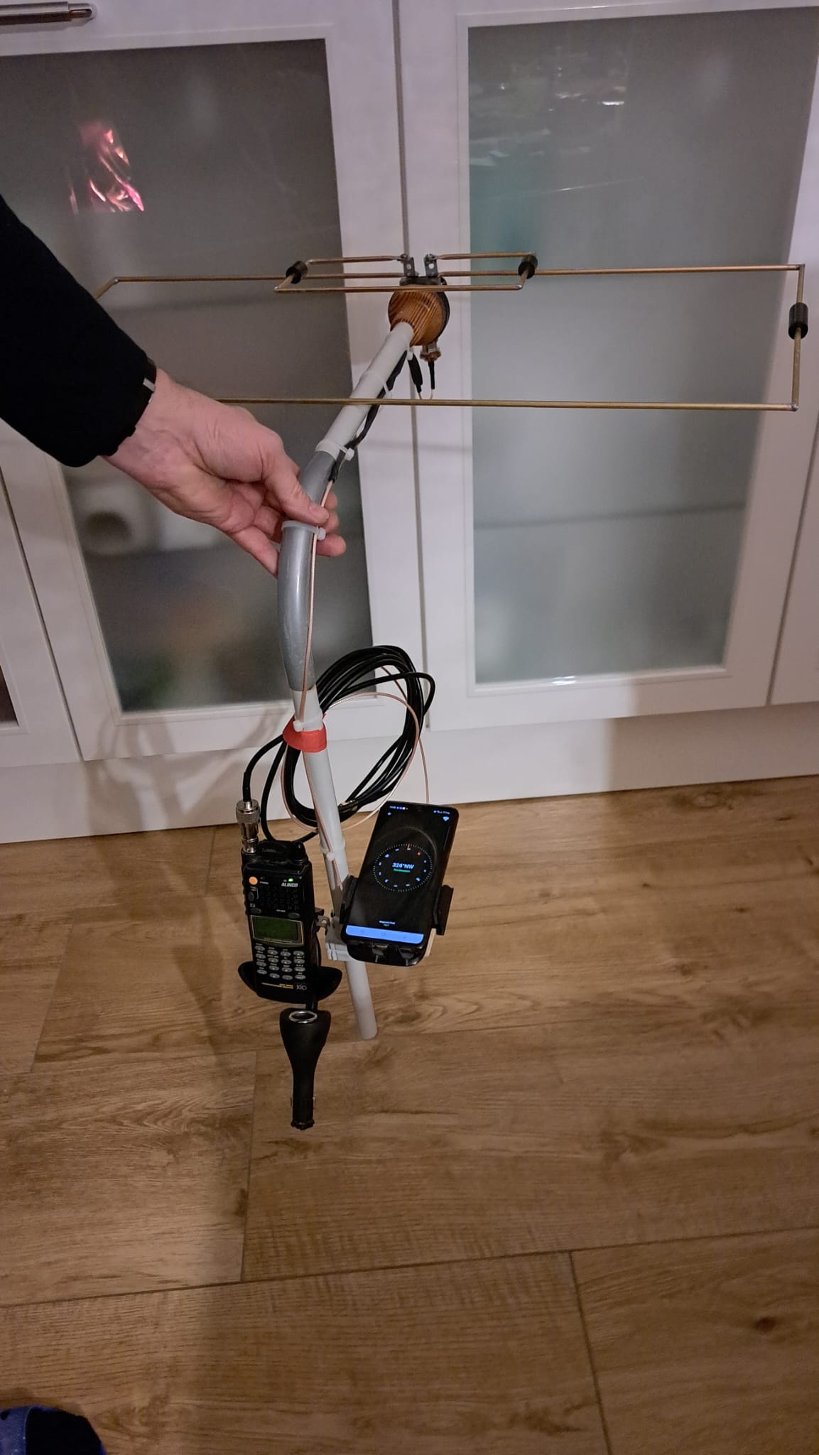 Peilantenne 2m 70cm Moxon![]() Um auch mal bei einer Fuchsjagd mitmachen zu können, habe ich im Internet folgende Bauanleitung für eine Peilantenne für 2m und 70cm nach G6XN Les Moxon sog. MOXON-Antenne gefunden: https://www.youtube.com/watch?v=WlzDXbE-x5Y oder: https://www.youtube.com/watch?v=YVxoLn2rXCw http://on5au.be/content/a10/moxon/mox20.html (Beschreibungengl.) Mithilfe des Programms MoxGen.exe (Moxon Rectangle Generator) von https://ac6la.com/moxgen1.html kann man sich für jede Frequenz und Drahtstärke die entsprechenden Abmessungen zum Bau einer solchen Rahmenantenne mit Richtwirkung bauen.Ich habe einen Rahmen für 2m und einen für 70cm gebaut aus Ø5mm Messingrohrstücken, die ich einfach an den Ecken miteinander verlötet habe. Als Isolatoren zwischen dem B und D - Rohrstück habe ich ein Kunststoff-Rundstück (Vollmaterial) beidseitig so tief eingebohrt, bis der berechnete Abstand(Isolator) entstand, dann noch etwas eingeklebt - fertig. Die kleinere 70cm Antenne ist einfach um ein paar cm oberhalb mit gequetschtem und anschließend eingesägtem Rohrenden mittels Schraube über Lochblech oben aufgesetzt. Man könnte diese auch einfach abschrauben und hat dann entweder nur eine 2m oder nur eine 70cm Antenne oder wie hier beides in einem.Als PVC-Rohr habe ich handelsübliche 20mm Elektroinstallationsrohre aus dem Baumarkt verwendet die ich noch herumliegen hatte. Als 90° Winkelstück dient ein abgesägtes Teil aus einem alten Campingstuhl, was genau in diePVC-Rohre passt. Ganz vorne befinden sich aus ehemaligen Gardinenstangenhalterungen aus Holz runde ineinander drehbare Wandstücke in die ich eine große ca. M10 Kunststoffschraube mit Gewinde eingeschraubt habe. Die beiden Scheiben haften recht gut aneinander, man kann aber mit etwas Kraft die ganze vordere Mimik samt Antennen um 90° seitwärts schwenken und somit auf vertikal peilen, wenn das denn mal notwendig sein solte. Als Übergang vom 50Ohm Koaxkabel auf die Antennendipole dient ein bekanntes Adapterstück mit 2 Bananensteckern auf BNC-Buchse. ich habe einfach die beiden Bananenstecker mit Sechskant und Gewinde herausgedreht und dort hinein stattdessen zwei Schrauben eingedreht zur Befestigung der gequetschten und mittig eingesägten Dipolendstücke. Am Griff unten links und rechts noch mittels der passenden 20mm Klemmhalterung die quer durchs Rohr mit M5 verschraubt wurde befinden sich: links: Schnellhalterung für einen Empfänger (hier mein Alinco Wideband X10) und rechts mein Samsung Handy, welches exakt parallel zur Antenne ausgerichtet ist, auf dem ich dann eine App mit digitalem Kompass anzeigen lasse zur genauen Peilung. Die Schnellhalterungen kann man von unten mit der Feststellschraube fixieren oder ggf. nochmals neu ausrichten. Die ganze Peilantenne kann man entweder unten am Rohr selbst festhalten in die Luft über dem Kopf sozusagen oder man hält diese am 90° Winkel von oben fest zum Transportieren und kann dabei herunter auf den Kompass blicken. Um sie ortsfest zu machen steckt man sie einfach mit dem Rohr auf einen ca. Ø18mm Zapfen auf ein Stativ.Nach dem Aufbau der Antenne habe ich diese mit meinem miniVNA F2 gleich mal in den Bändern 2m und 70cm durchgemessen und mit diesem Aufbau ein SWR von unter 1:1,2 erhalten über eine große Bandbreite. Auch in den höheren Frequenzen von weit über 450Mhz ist das SWR immer noch weit unter 1:2. Eine tolle und vor allem sehr einfach aufzubauende Antenne mit hervorragender Richtwirkung. Viel Spaß beim Nachbau ! ![]() ![]() ![]() ![]() |