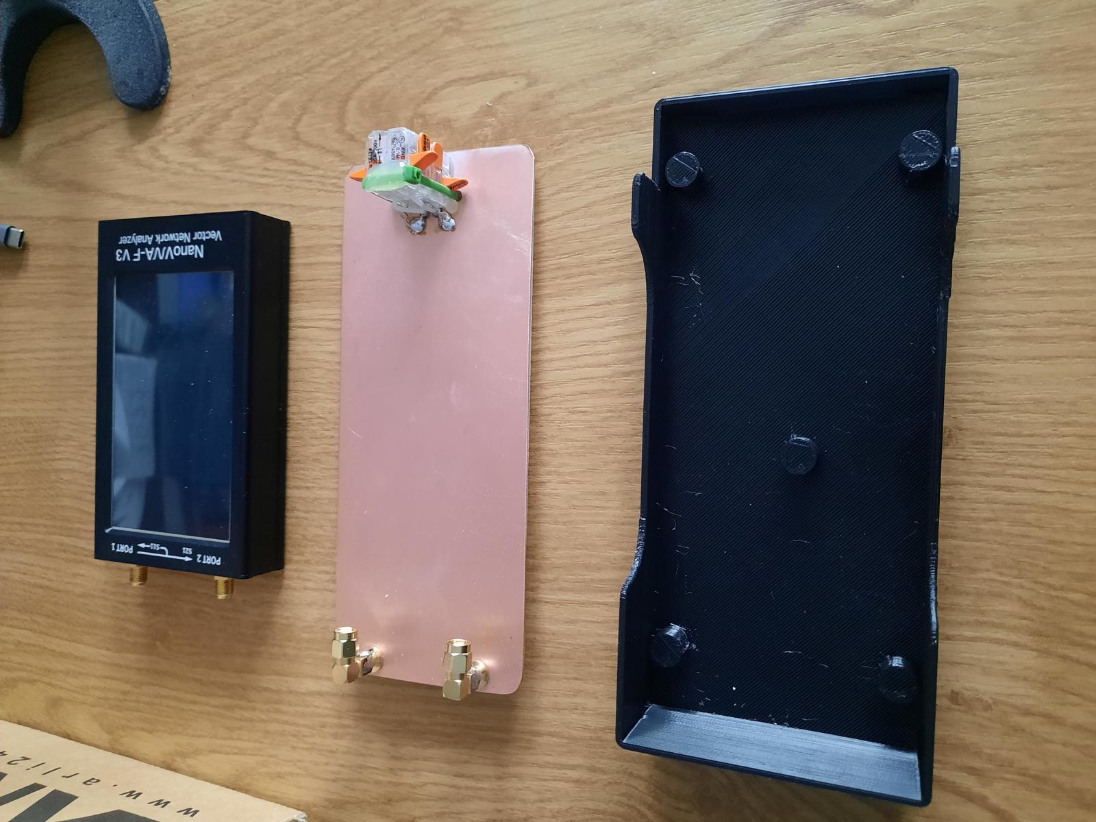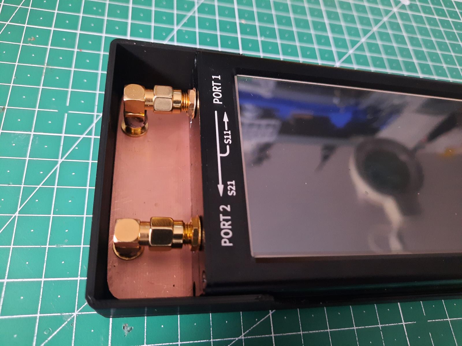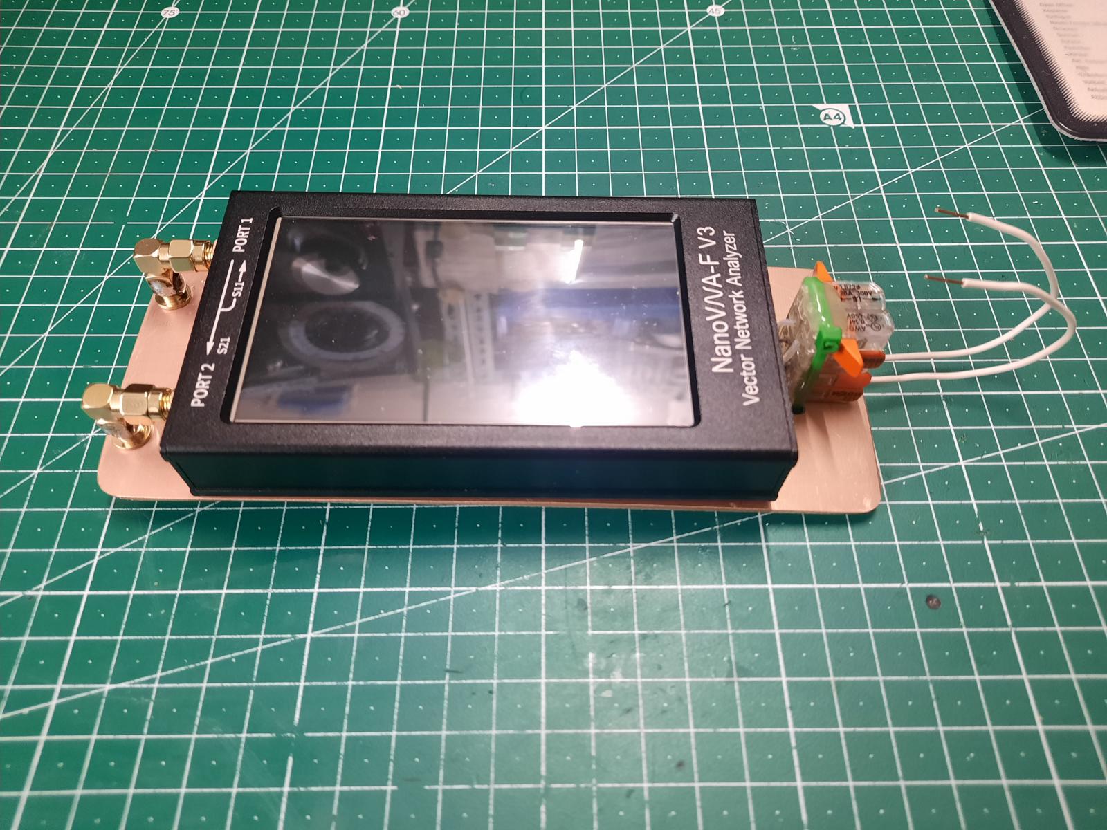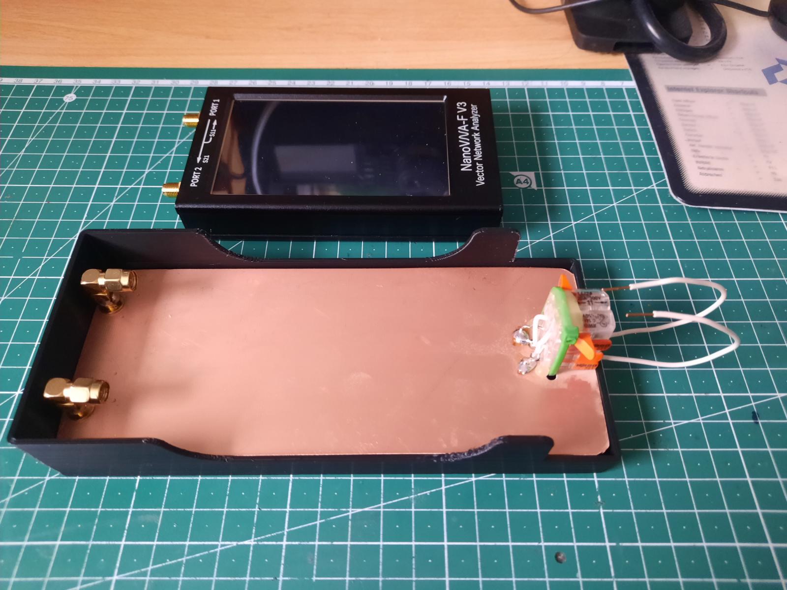 Um schnell mal mit dem beliebten NanoVNA diverse Ringkerne zu testen und direkt den AL-Wert anzeigen zu lassen habe ich gem. DK3SS diesen nachgebaut und in ein 3D-Druckgehäuse gesetzt. Den NanoVNA kann man durch Abschrauben der beiden SMA-Anschlüsse leicht wieder entfernen. Die beiden Drähte einfach durch den zu prüfenden Ringkern schieben und oben mit den weiden WAGO-Klemmen festklemmen. Die Koax-Verbindungsleitungen verlaufen unterhalb der Kupfer-Leiterplatte. Links habe ich aufgrund der Höhe einen Durchloch-SMA-femal-Verbinder mit einem 90° RP-SMA zusammengesteckt und die Masse rundum verlötet. Alles schön mit der Masse der Platine verbunden sollte das HF-mäßig gut passen. Weitere Infos zum genauen Aufbau auf der Seite von DK3SS.